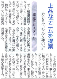 【メディア掲載】繊維ニュース/篠原テキスタイル|上品な風合いの新素材デニムを提案