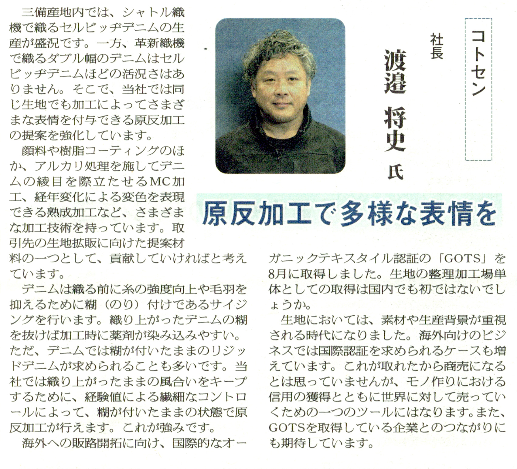 記事では、三備産地でのデニム原反加工における同社の取り組みが紹介されています。